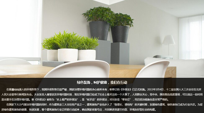 當(dāng)PM2.5、霧霾、空氣質(zhì)量指數(shù)等詞語越來越多地成為城市人討論的話題時,一批有責(zé)任、有擔(dān)當(dāng)?shù)慕ㄖb飾企業(yè)紛紛將“綠色裝飾”定為自己的長遠(yuǎn)發(fā)展目標(biāo)。
